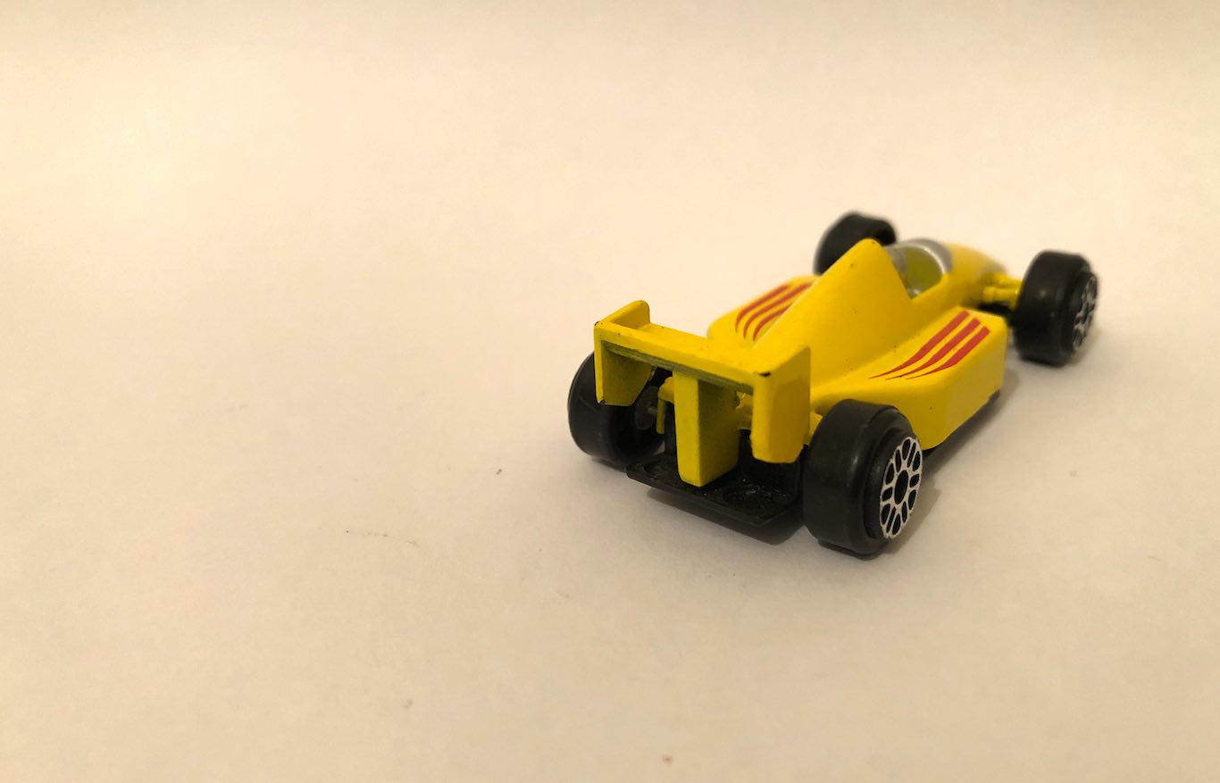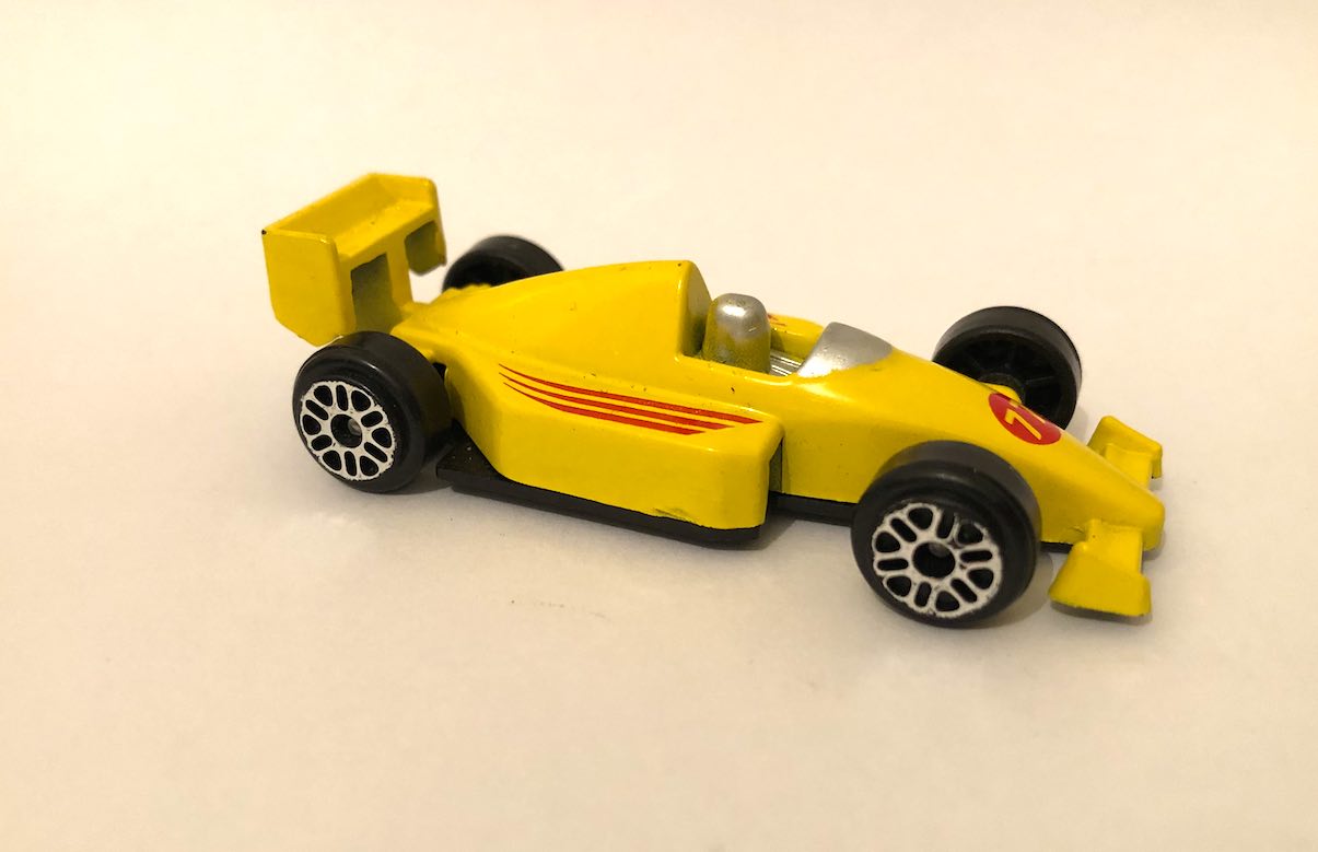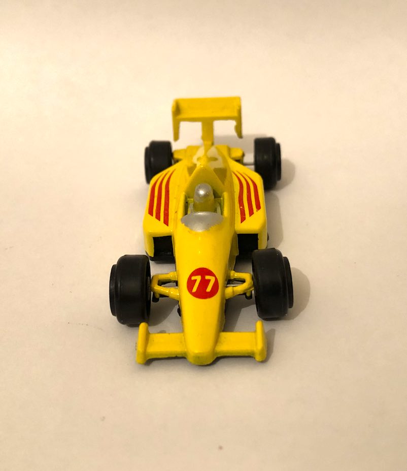 Small number 77 Yellow F1 Car Toy, approx. 5cm long by unknown Brand Ā® Made in China, unknown if still in production.
